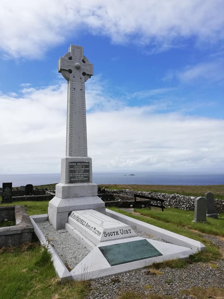そこから歩いてすぐのキルミュア墓地の一際背の高い十字架が、1970年にフローラ・マクドナルドが埋葬された場所です。ジャコバイトと呼ばれる反乱軍のリーダー、ボニー・プリンス・チャーリーは、カロデンの戦いで負けた後イングランド政府軍に追われる身でした。フローラは女装した王子を侍女だと偽って本土からスカイ島へ連れて行き、そこで王子はフローラと別れてさらにフランスへと逃れて行きました。