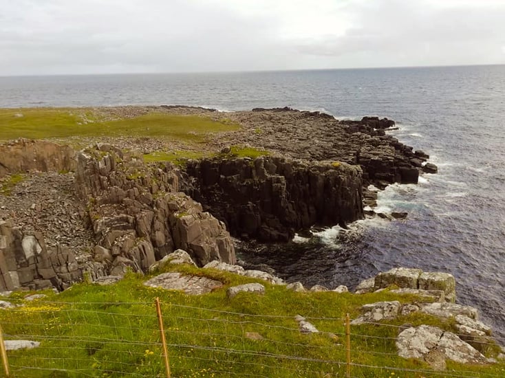 90mの高さのキルトロック。民族衣装キルトのプリーツのように見えるのは砂岩の土台の上にある玄武岩の柱で、流れ落ちる滝と合わせた景観はとてもドラマチック。