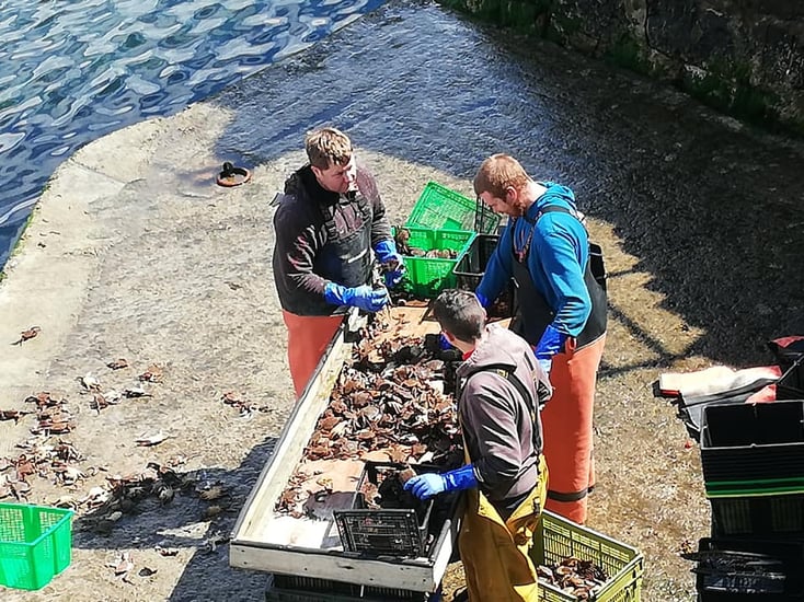 漁師が蟹をたくさん捕まえて帰って来ました。選別作業を観光客が興味深く見守ります。
